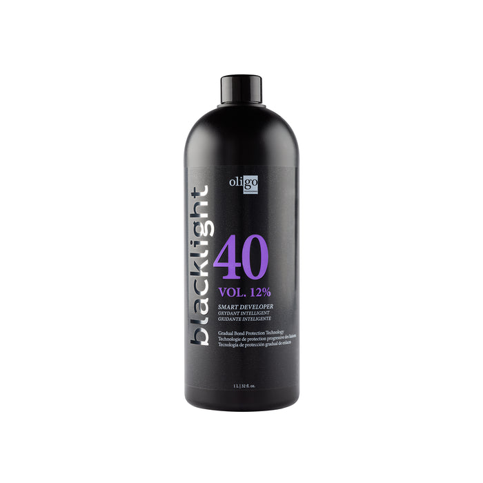 Oligo Blacklight Smart Developers are enriched with Oligo Gradual Bond Protection technology. This technology strengthens hair bonds and protects the surface of the hair during chemical treatments while also replenishing and preventing the loss of natural lipids in the hair. As the power of the developer increases, so does the level of protection!